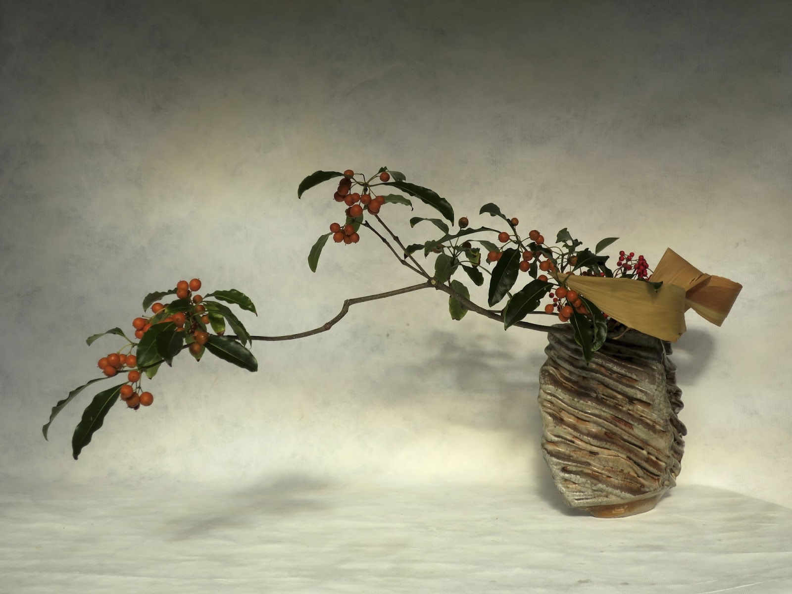 This is the previously published photo of my arrangement that I had re-constructed at home after the workshop. Last week I returned to the exercise using the same berry bearing materials to which I have added dried aspidistra leaves for a textural contrast.
